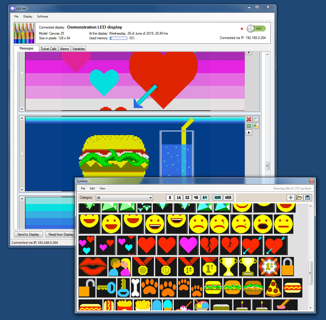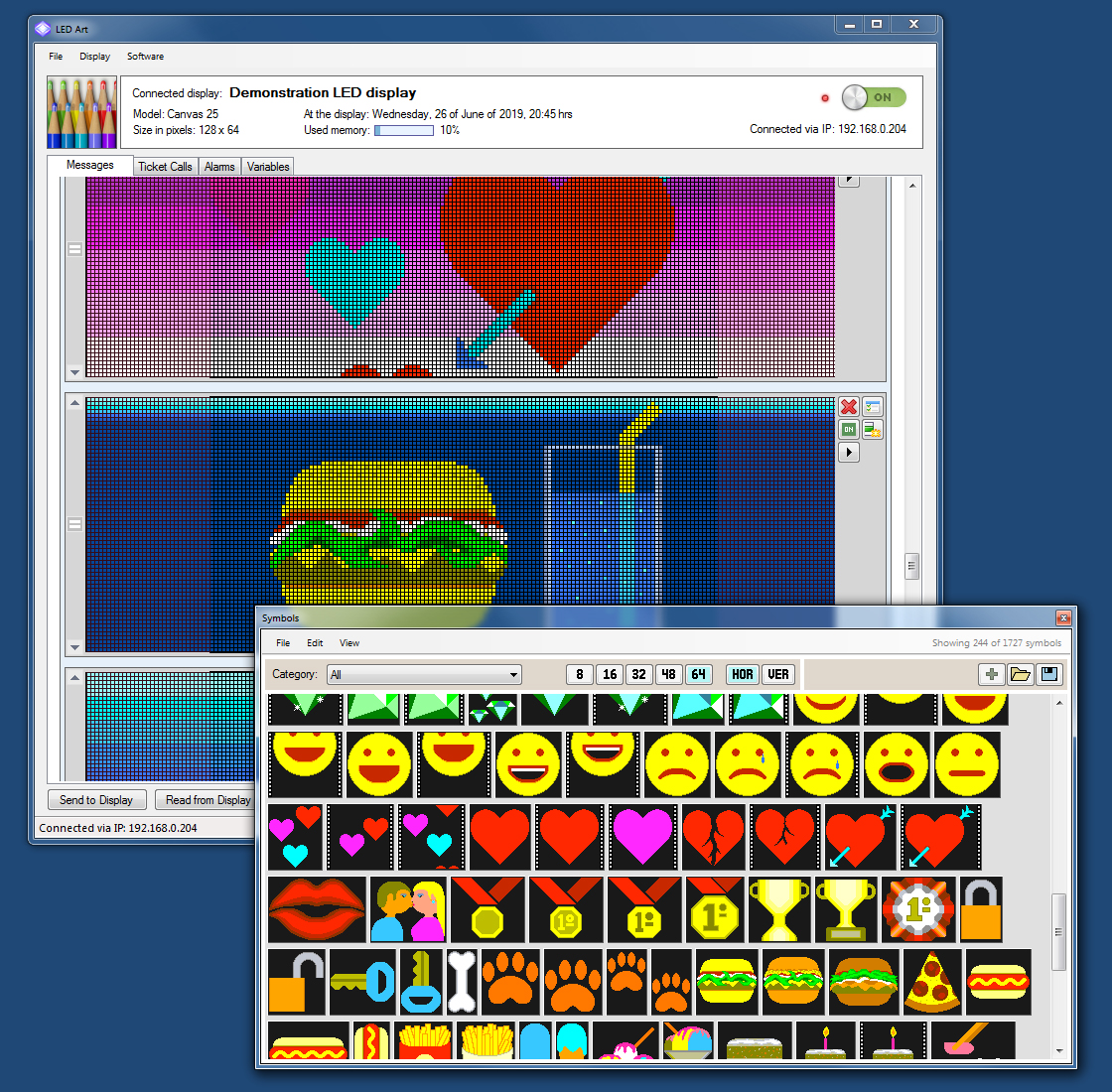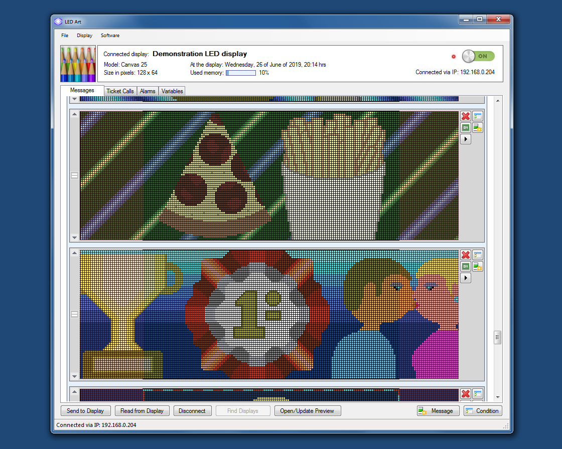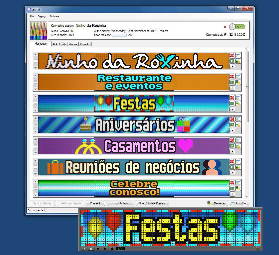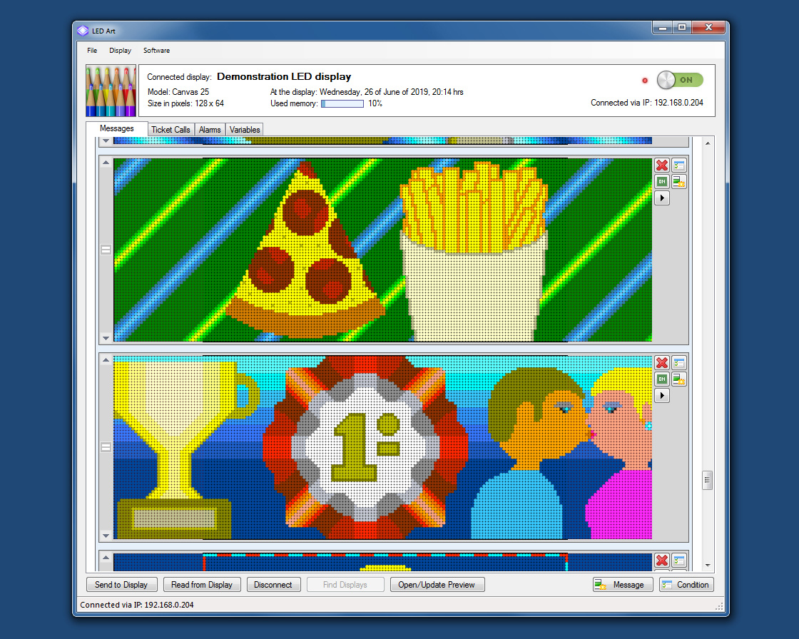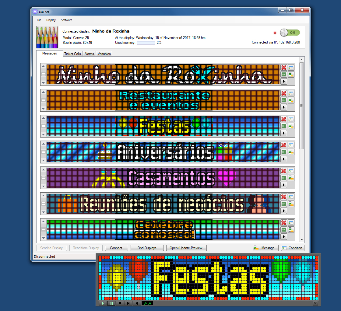 This video shows the LED display control software connecting to the LED display, reading its messages, and then performing a few operations, mainly to show the basic functionality of the display. Notice the conditions; those blocks that wrap a few messages and say, for example: "Every Friday". The messages inside those blocks will only show when the condition is met. They add a lot of functionality to the display, as demonstrated by some examples in this video.