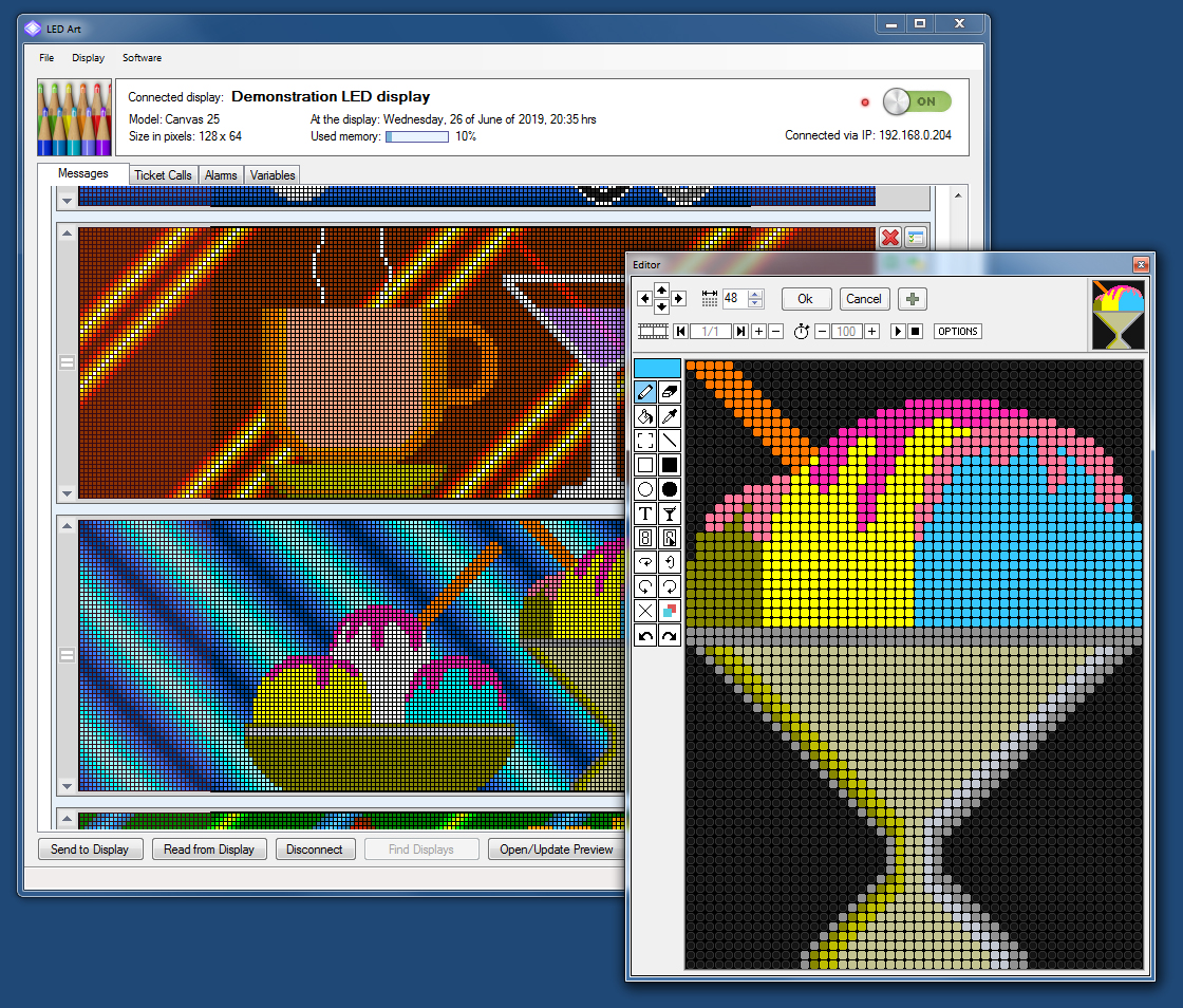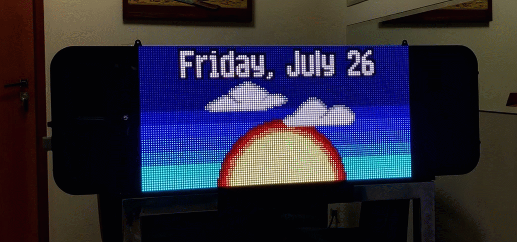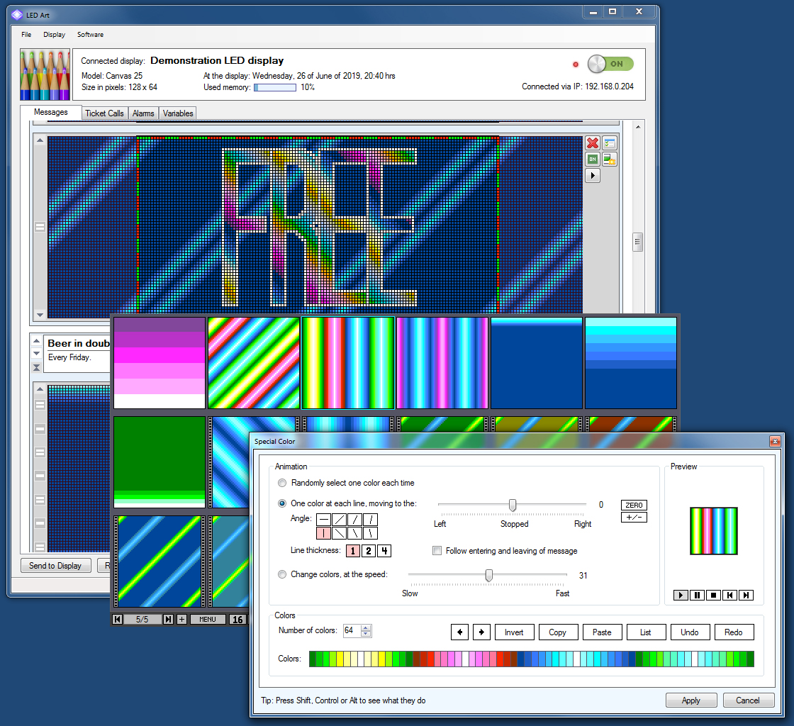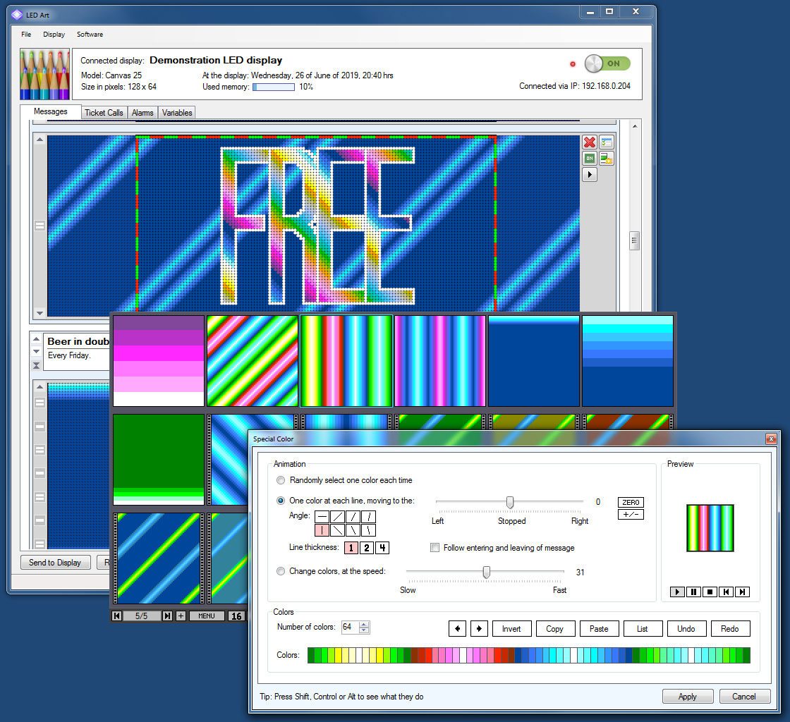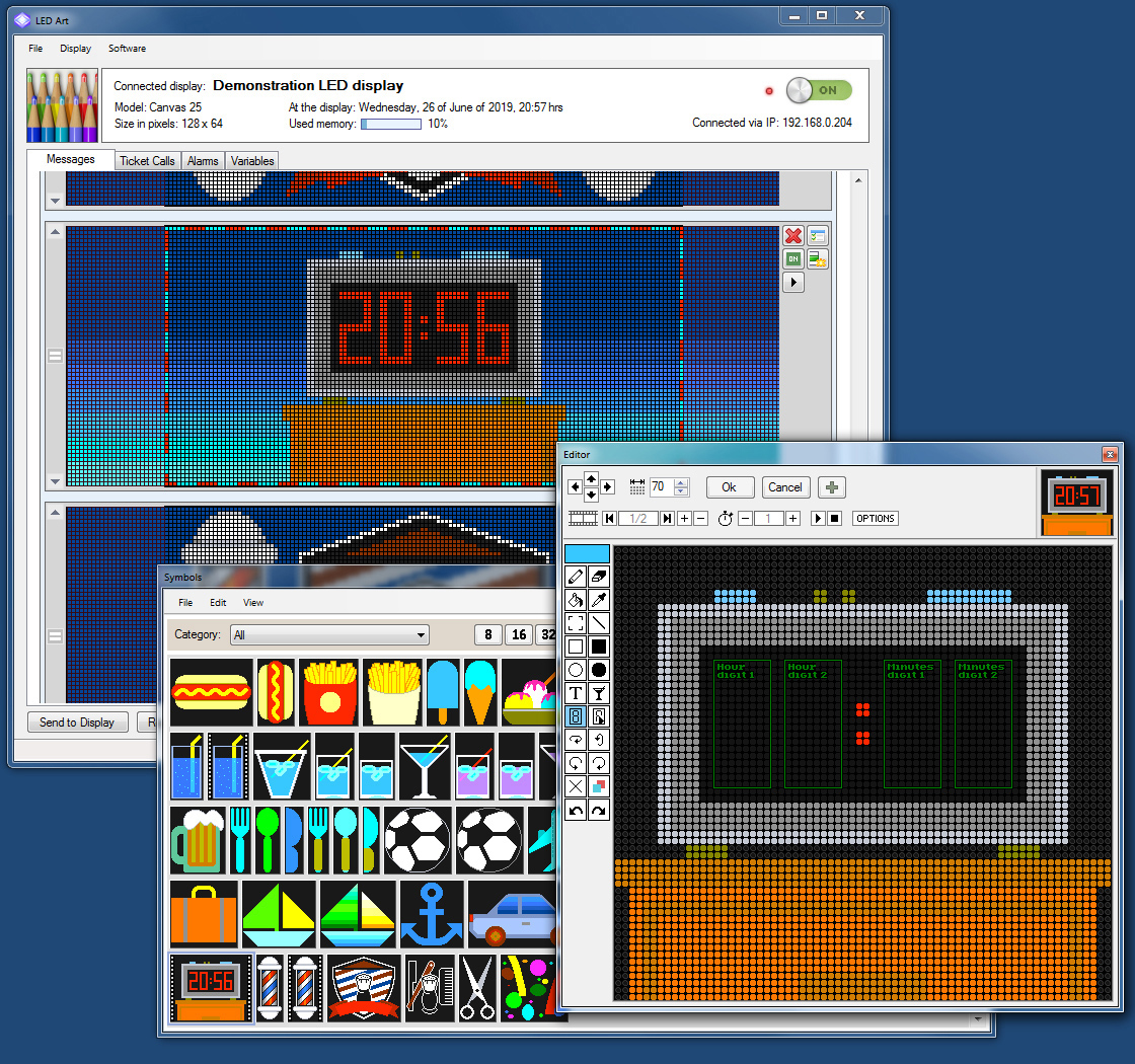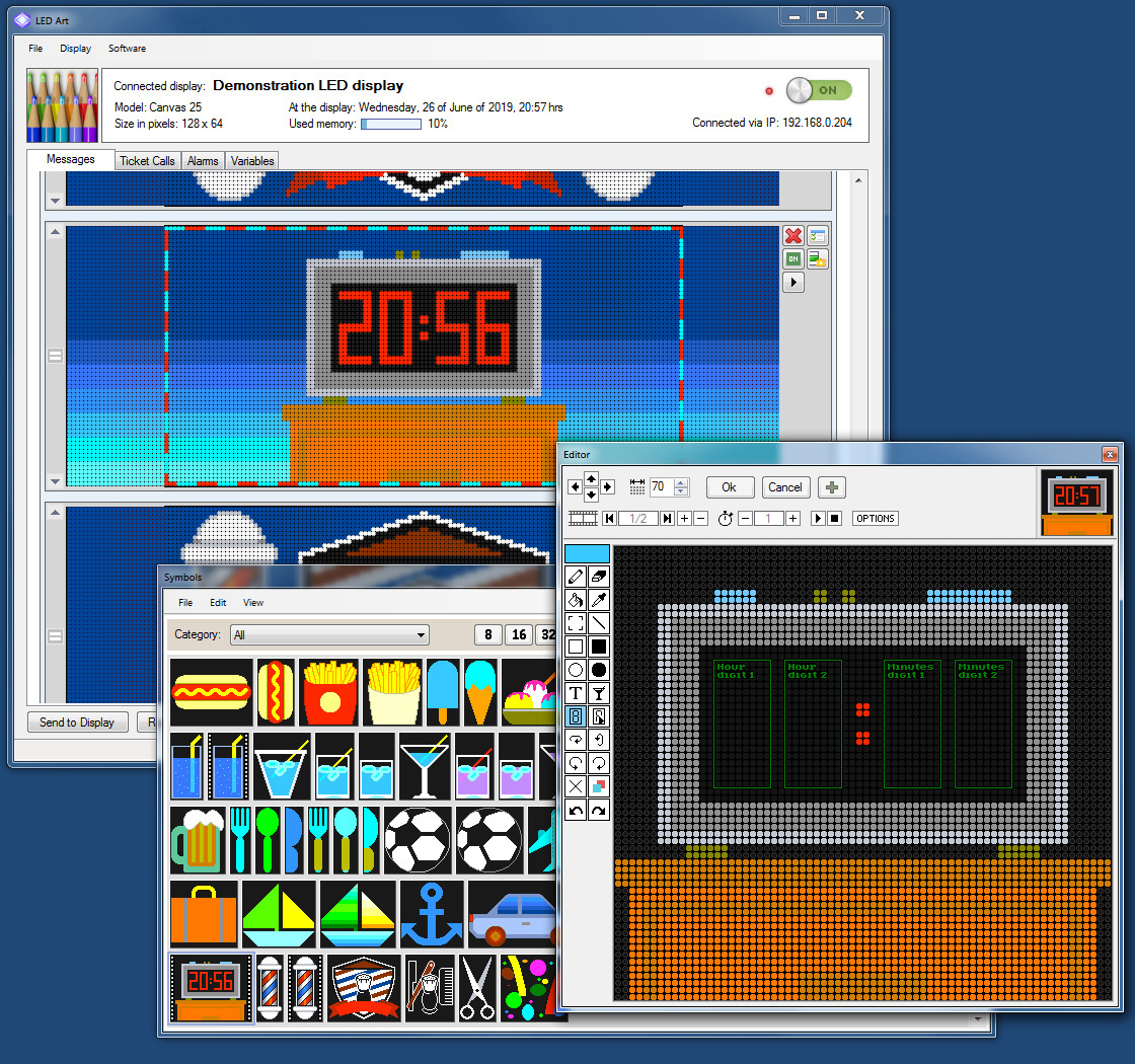 This video shows the LED display control software connecting to the LED display, reading its messages, and then performing a few operations, mainly to show the basic functionality of the display. Notice the conditions; those blocks that wrap a few messages and say, for example: "Every Friday". The messages inside those blocks will only show when the condition is met. They add a lot of functionality to the display, as demonstrated by some examples in this video.