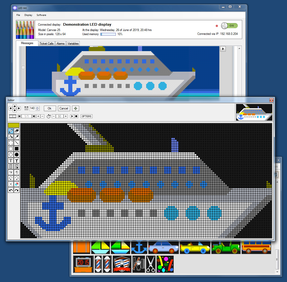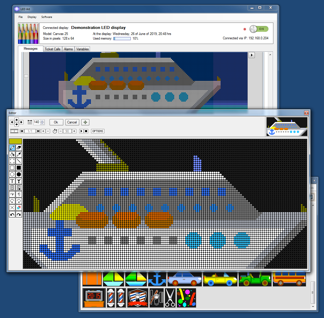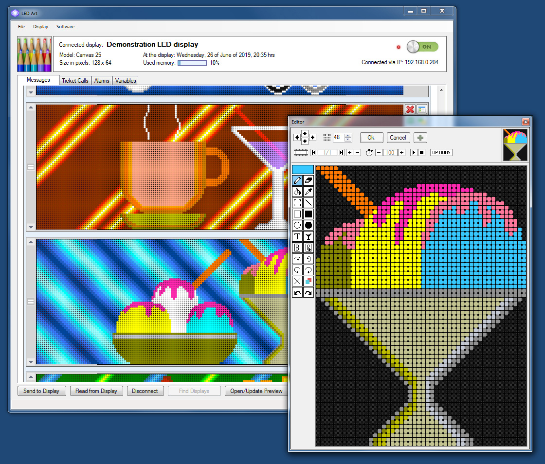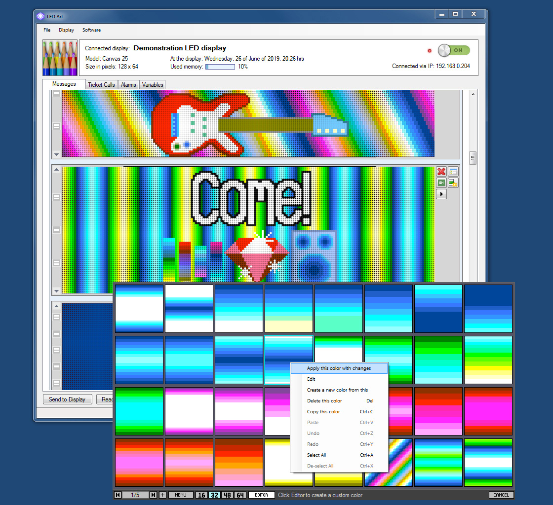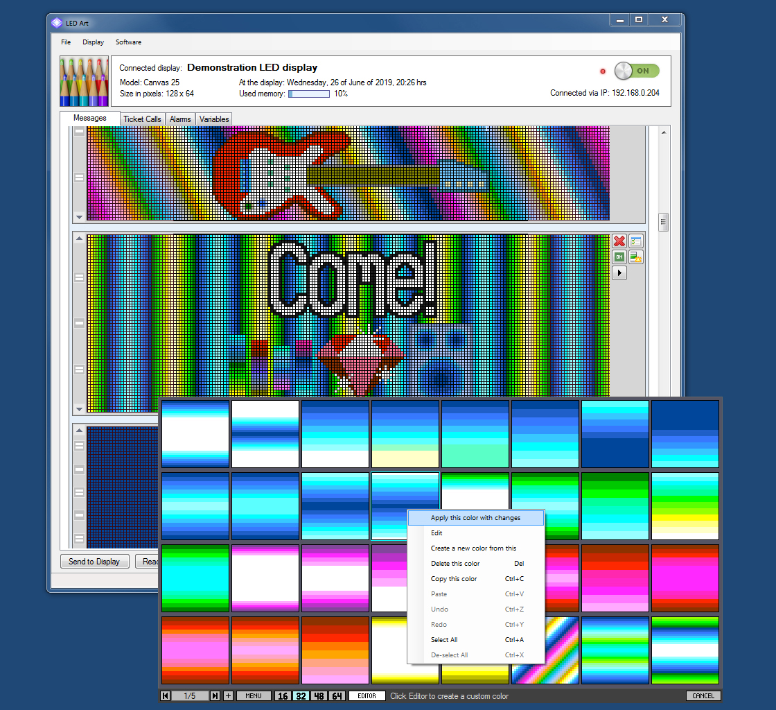 This video shows the LED display control software connecting to the LED display, reading its messages, and then performing a few operations, mainly to show the basic functionality of the display. Notice the conditions; those blocks that wrap a few messages and say, for example: "Every Friday". The messages inside those blocks will only show when the condition is met. They add a lot of functionality to the display, as demonstrated by some examples in this video.
