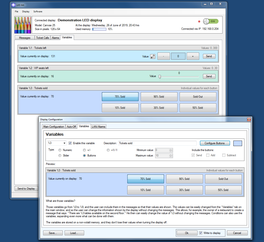 LED Display Software Demonstration, Part 2This continues the demonstration of the LED display control software. If this video is not playing on your browser, click here to download it. About this videoThis is a continuation of the LED display control software demonstration. This video show the ticket calls, alarms, variables, configuration options, daylight savings time, USB flash drive, auto-brightness, auto-off and the variables configuration area, also giving a better look into the conditions and demonstrating the variables in use. Note that the ticket calls is currently under development. Back to main page |