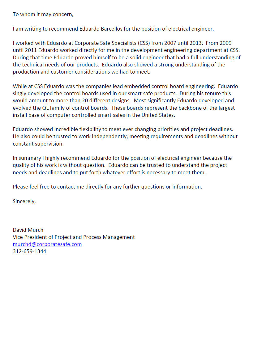 Em resumo, eu dou minha grande recomendação de Eduardo para a posição de engenheiro elétrico por que a qualidade de seu trabalho é inquestionável. Eduardo pode ser confiado para entender as necessidades dos projetos e os prazos e fazer o que fosse preciso para cumpri-los.